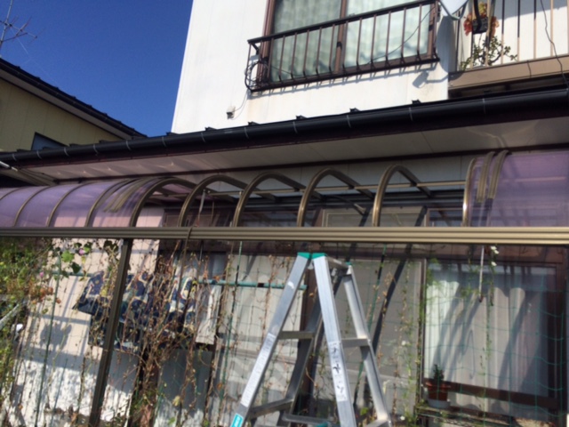 冬が来る前に、落雪で破損したパネル修理です!樋も壊れていましたので交換します(^ ^)