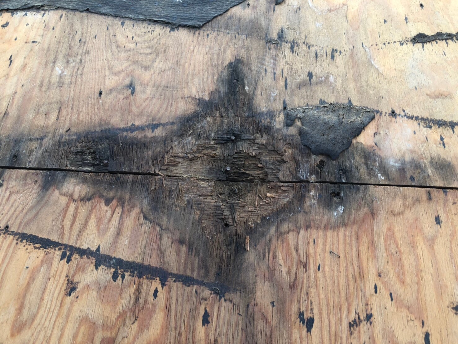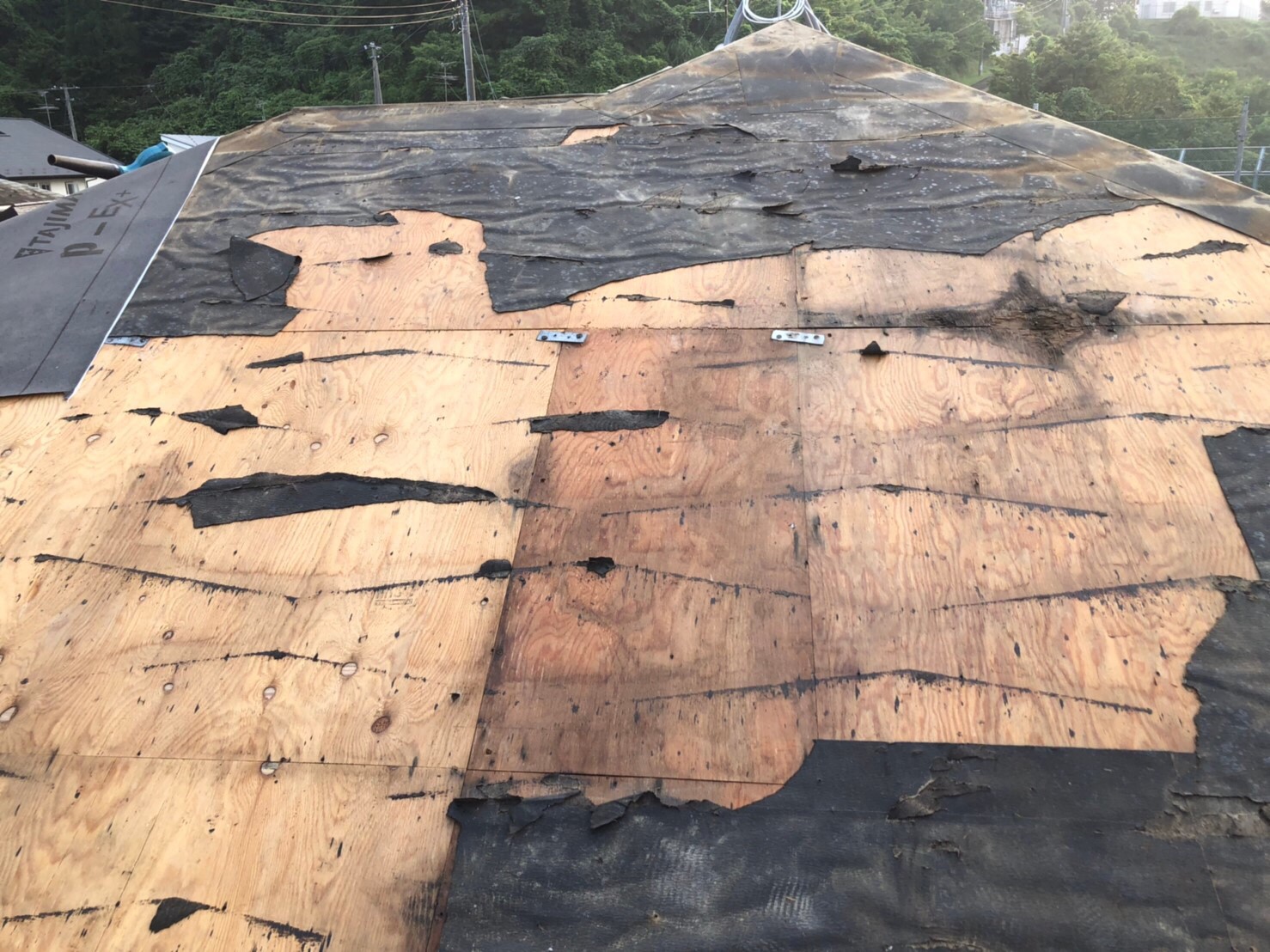 太陽光パネル設置時のねじ穴より雨漏りがひどく屋根の葺き替え工事となりました。既存屋根材を剥がします。