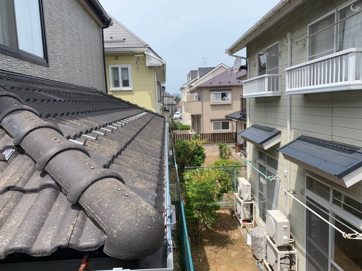 屋根は経年劣化により汚れや色あせが目立ちます。