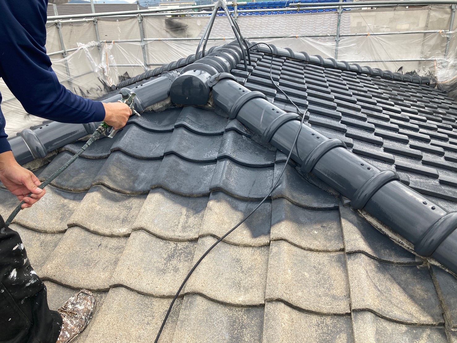屋根下塗り。セメント材専用の下塗り剤を吹き付けます。