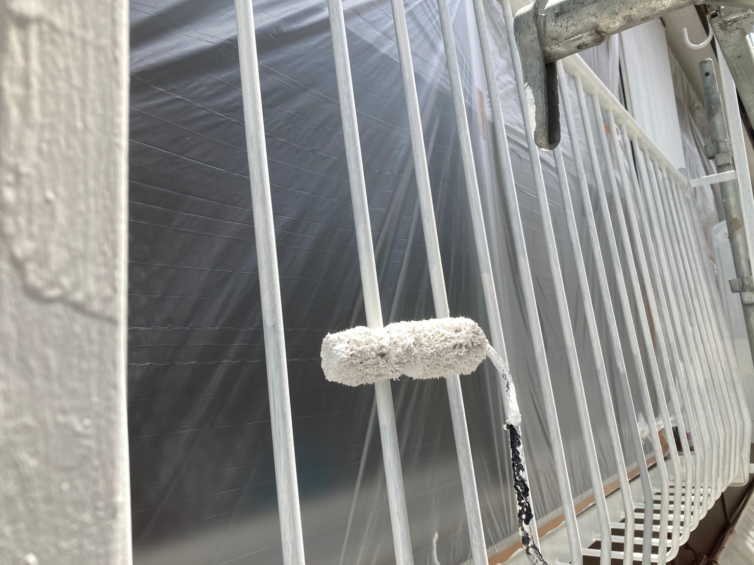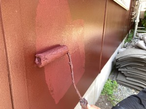 外壁上塗り。 手塗ローラーで3回塗り。厚くしっかりした塗膜を形成します。