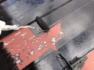 屋根上塗り。手塗ローラーで3回塗り。厚くしっかりした塗膜を形成します。