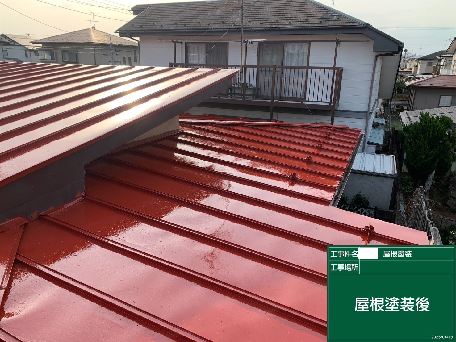 屋根上塗り 手塗ローラーで3回塗り。厚くしっかりした塗膜を形成します
